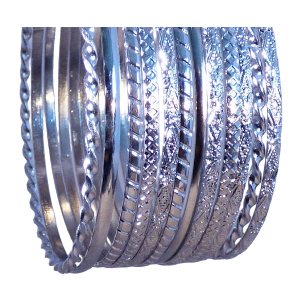 Zilverkleurige armbanden met verschillende designs. Ze zijn een aanwinst voor je collectie, de set bestaat uit 10 armbanden.
