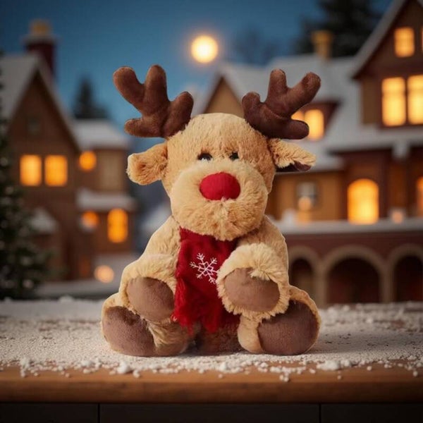 Met zijn zachte bruine vacht, rode neus en warme sjaal is Finn klaar om gezelligheid te brengen, waar hij ook staat.