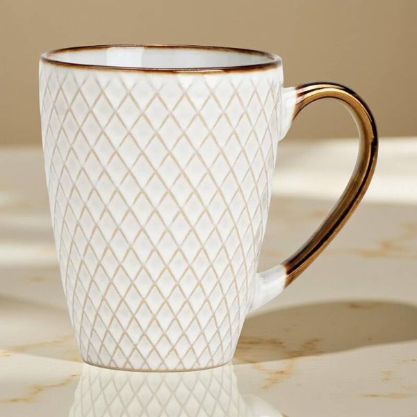 De mokken hebben een subtiel diamantreliëf en een verfijnde goudbruine rand, wat zorgt voor een chique maar warme uitstraling.